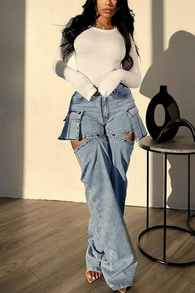 OFF SHOULDER STRETCH JUMPSUIT WITH WIDE-LEG AND MULTI-POCKETS DENIM