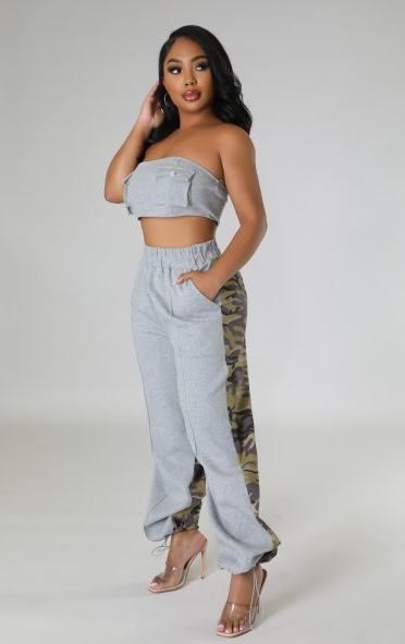 TWO-PIECE HIGHWAISTED SEMI-STRETCH PANT SET WITH DRAWSTRING BOTTOM GREY and CAMO